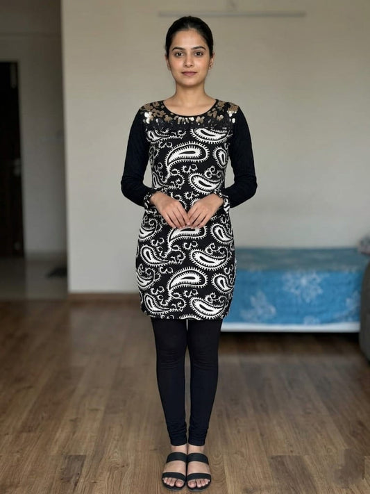 Paisley Print Long Sleeve Tunic Dress with Gold Sequin Neckline