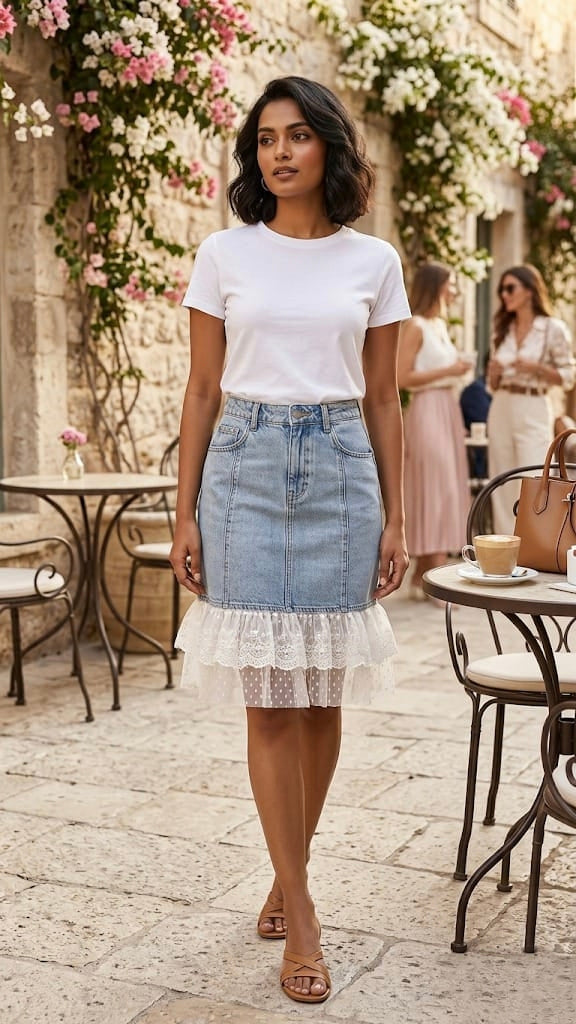 Lace-Hem Denim Diva: Vintage Wash Midi Skirt